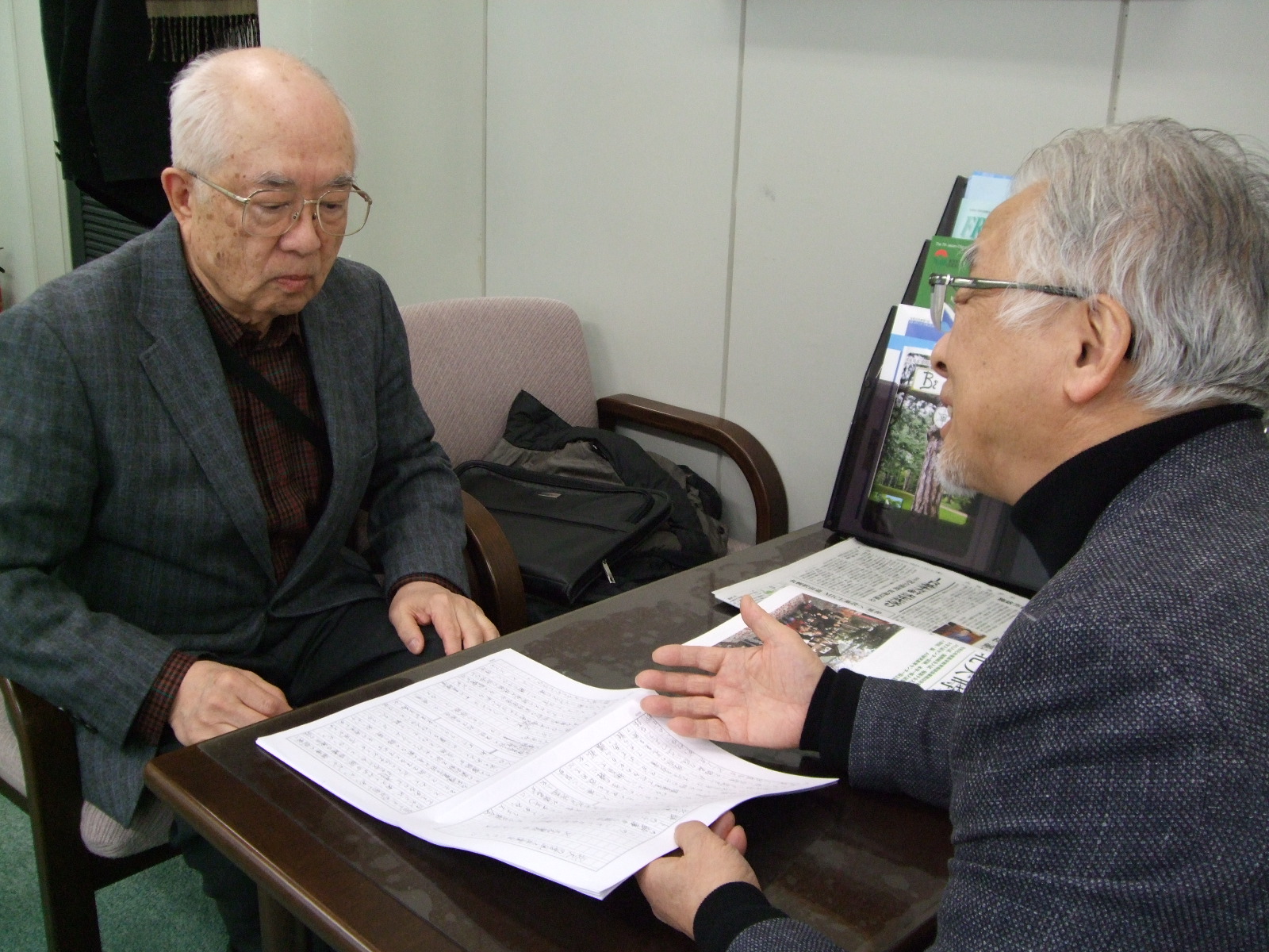 札幌本部 2020.01.21 「会報原稿打ち込みます」 同窓会員から寄せられた同窓会報の手書き原稿を電子データ化する作業(交通費支給)を、どなたかに手伝って頂けないか、と事務局で考えておりましたら、寺尾日出男相談役(写真左)が買って出てくださいました。 寺尾相談役は1月21日に事務所を訪れ、400字詰め原稿用紙28枚を、松井理事長(同右)から受け取り、「それほど日数はかからずにできると思います。これからも、声をかけてください」と話されました。また、「会員ができることをやるのは良いことだ」とも。 松井理事長は「ありがとうございます。ゆっくりの作業で結構です。みんなでつくる同窓会にしていきたい」と述べました。