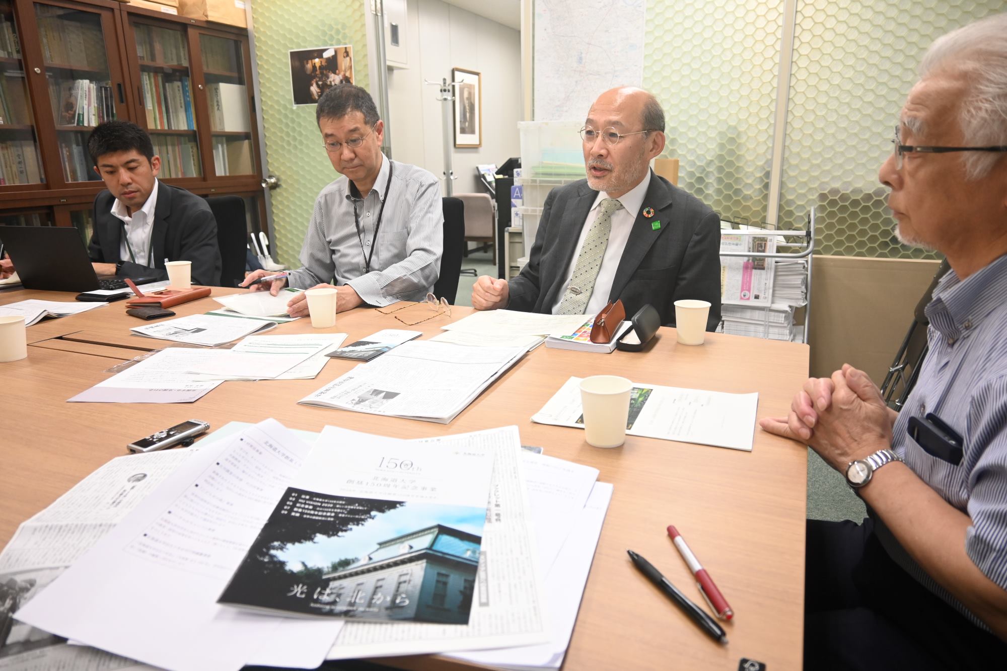 札幌本部 2024.08.05 「北大150周年事業」の周知・寄付促進を 横田北大副学長 北海道大学理事・副学長の横田篤先生(元農学研究院院長、当会顧問)が3日、当会事務所に来訪し、「北海道大学創基150周年記念事業」の会員等への周知、及び個人寄付の促進などの協力を訴えました。 北海道大学は、前身である札幌農学校の1876年開校から150周年となる2026年を中心に、記念事業を計画しています。同年9月下旬に記念式典を催すほか、古河講堂(旧林学科教室)の改修利活用事業、学生の視野を世界に広げる人材育成事業、「こども本の森」事業、大学150年史の発刊などに取り組んでいます。 また学内でも最も古い歴史を持つ農学部と農学同窓会は、独自の貴重な歴史的資料を収集、分析、保存し社会に広める「お宝発掘発信プロジェクト」、農学部中央棟最上階鐘楼の鐘を修復し音を復活する「エルムの鐘プロジェクト」、新渡戸稲造夫妻が始めた札幌遠友夜学校の跡地に社会教育を中心とした地域づくりの生きた実験拠点「新渡戸遠友リビングラボ」を建設運営するプロジェクトなどの関連事業に注力し、一部は実現しています。 横田副学長らはこの日、全学の事業を詳しく説明するとともに、当会に対して「大学150周年の意義と、それを祝い発信する事業全体を、会員の皆さんに周知していただきたい。事業の成功に向けて個人からの寄付を大いに募っていただきたい」「また農学同窓会の事業を全学150年事業に反映し、協力していただきたい」と、当会に多面的な協力協働を要請しました。 当会は、松井博和理事長、瀬戸篤会計担当副理事長、久田徳二理事・事務局長、橋本博行理事・事務局次長の4人が対応。最大限の協力協働の意思を伝えるとともに、当面、当会の会報61号での記事掲載、寄付振込用紙の会報封筒への同封に同意し約束しました。 上の写真:【北大150周年記念事業への協力を訴える横田副学長(右から2人目)と本部社会共創部広報課の担当者二人。右端は当会の松井理事長】 (事務局)