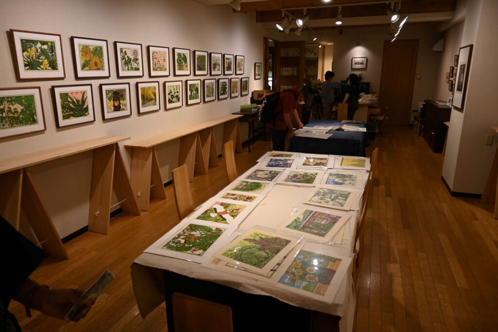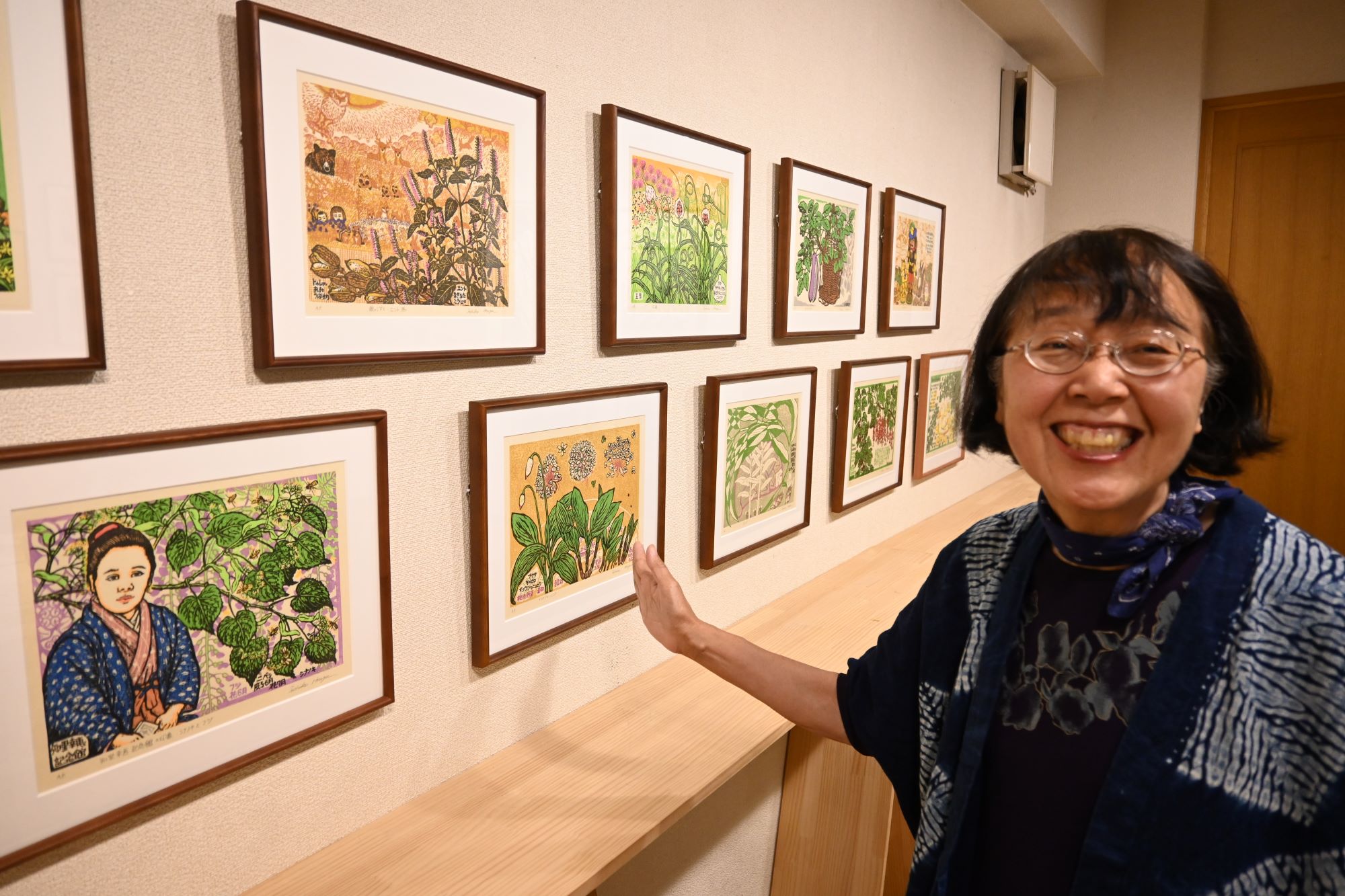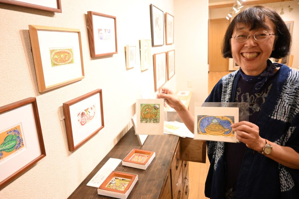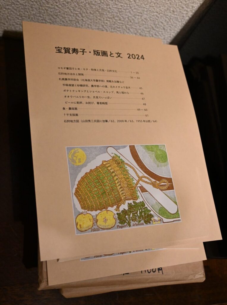 札幌本部 2024.07.12 「宝賀寿子 版画と文展」始まる 16日まで 当会会員の版画家・宝賀寿子さん(農化、1973年卒)の個展、「版画と文展」が11日、札幌市中央区北1条西3丁目のマリヤ手芸店で始まりました。額装された大小の版画や、葉書大の版画などまで200点以上が展示・販売され、初日から多くの人が来場し、”宝賀ワールド”を堪能していました。16日まで。 宝賀さんは当会会員名簿の表紙、会報・会誌の挿絵なども積極的にご寄稿いただいており、その版画の独特のデザイン、個性ある文章をご存知の方々も多いと思います。 会場には、当会会誌に多く掲載されている農作物に関する版画と文章をはじめ、道内の農業や食文化、地誌と地形、鉄道、アイヌ民族の食と文化など幅広いテーマに関する絵や考察文、著作物などが展示されています。 【額装版画(写真左)や額装されていないシート状の版画(中央)など、全部で214点が展示されている(それぞれ売り切れれば点数は減ります)】 作物の実だけでなく花、葉、茎などを細部にわたって写実的に描いた絵から、作物の成長過程を1枚の絵に納めたもの、栽培や食の歴史を掘り下げる中で宝賀さんに浮かんだイメージやエピソードをメルヘン調に描いたものなど、一点一点が異なる印象と物語性を持っていて、多くを観賞しても飽きない作品群です。 【干支をモチーフに描いた葉書大の版画を手にする宝賀さん。年賀状にする人も多いという】 画中の要素にすべて意味があると言っていいのですが、もし想像と理解が進まない場合は、宝賀さんのお時間が許す限り、宝賀さんに聞いてみるのも面白いかもしれません。作者はすべて答をお持ちだと思います。 作品群は、額装された版画48点(大小さまざま)をはじめ、画用紙大くらいの厚紙に印刷された版画、葉書大の版画などまで、全部で214点。すべてが販売されています。 また、宝賀さんの考察文や論文をまとめた資料、過去の出版物も展示(非売)。最新著作『宝賀寿子・版画と文 2024』の冊子=下の写真=は販売されています(税込1,100円)。 【展示会の作品が網羅されている冊子『宝賀寿子・版画と文 2024』】 展示会は16日までの連休を含む6日間、いずれも10時から18時まで(最終日だけ16:30まで)開催され、入場無料。多くの日は宝賀さんが会場にいらっしゃる予定です。 (事務局、写真も)