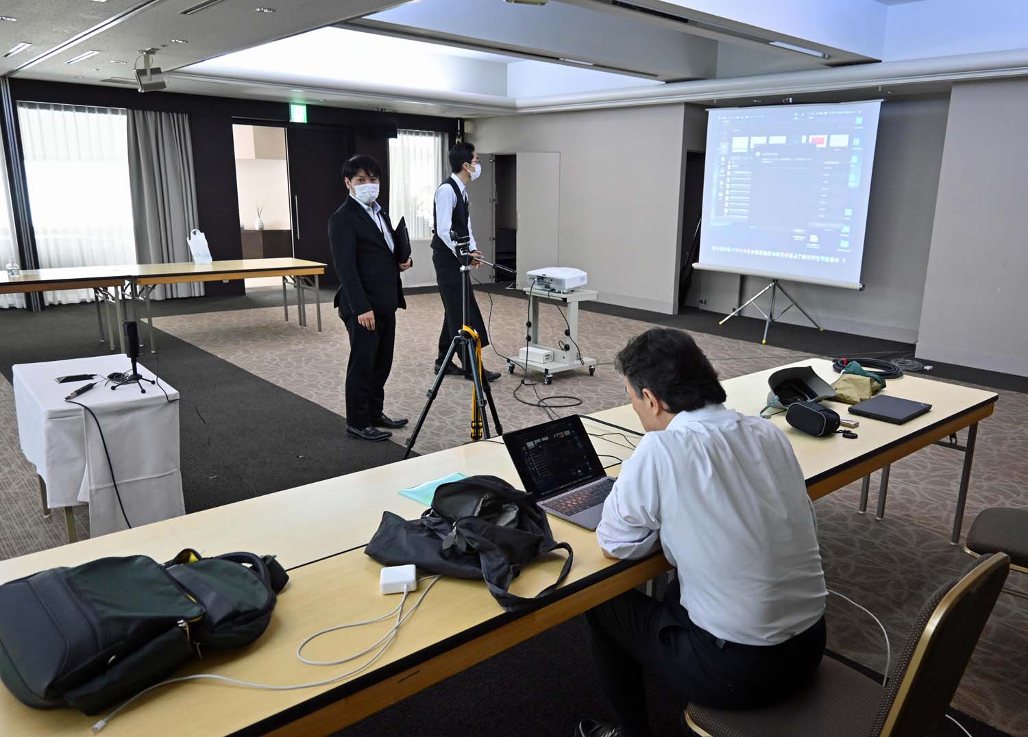 札幌本部 2020.08.19 オンライン総会に向け通信テスト 新型コロナウイルス感染拡大の折、代議員と役員の健康維持、感染拡大防止の社会的責任の観点から、9月の臨時総会はオンライン参加を基本とすることとなり、当会としては初めての「オンライン総会」の準備が進んでいます。8月12日にはそのための通信テストが行われました。 9月25日の臨時総会のメイン会場は、札幌市内のホテル会議室に置きますが、大阪にも臨時会場を設けてオンラインで札幌とつなぎます。大阪には関西の理事、代議員が集まる予定です。また東京の理事、代議員と、道内の多くの役員と代議員も、自宅や職場等で個別にPCなどに向かい、オンライン参加する予定です。 総会当日は、10人程度集まる予定の札幌会場の大きなスクリーンに、大阪会場をはじめ、各参加者の顔が映し出され、札幌会場に設置するカメラは、同会場全体の様子を撮影して、ライブで全国に送られる予定です。音声も出席者全員が、意見を交わせるようになります。 12日のオンラインテストでは、札幌会場に岩渕情報担当理事と久田理事事務局長、白石事務局員が、ホテル関係者とともに、スクリーンとマイクやカメラ、PCなどの機器を接続したテストを行いました。また大阪会場となる北大会館からは波多代議員が、同時に橋本総務担当理事が江別の自宅から、それぞれのPCでオンライン参加しました。 テストでは、会議室内の発声位置によっては聞こえにくいこともあったため、座席配置やマイク位置、カメラの角度などを調整することにしました。また、画面や音声が時々途切れることもあったため、当日は、札幌会場以外の音声と画像をオフにした状態にしておき、発言の際に、発言者だけオンにするなどの工夫が必要であることも分かりました。 大阪と札幌・江別の空間距離は問題にならず、調整が良ければ音声もクリアであり、テストは総じて良好に終わりました。このため、オンライン総会は実施が充分可能であるとの見通しを持てました。 これを受け、役員・代議員には、早ければ9月初日にも招集通知と関係書類をお送りするとともに、追って、Zoom Meeting のための Setting をメールで送信する予定です。各位のPCなどにZoomをインストールするなどの準備を進めておいていただければ幸いです。