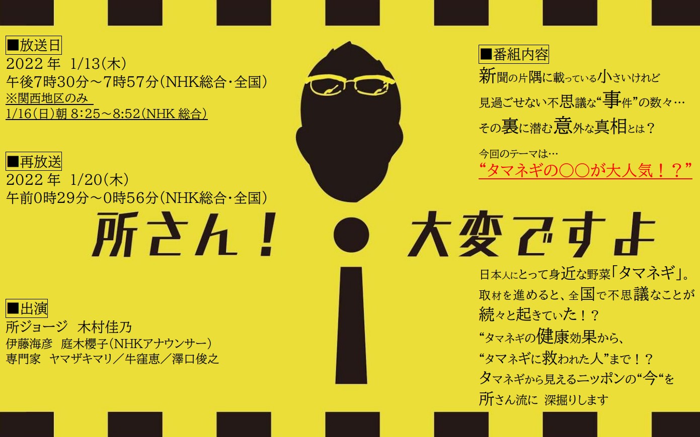 札幌本部 2022.01.11 タマネギ専門家・西村監事が出演へ タマネギ研究の第一人者である当会特別会員で監事の西村弘行氏(東海大・北翔大名誉教授)が、1月13日(木)午後7時30分~57分放送のNHK総合番組「所さん!大変ですよ」に出演します。 今回のテーマは「タマネギの○○が大人気!?」。西村氏は専門家の立場から、タマネギの健康効果についてコメントします。