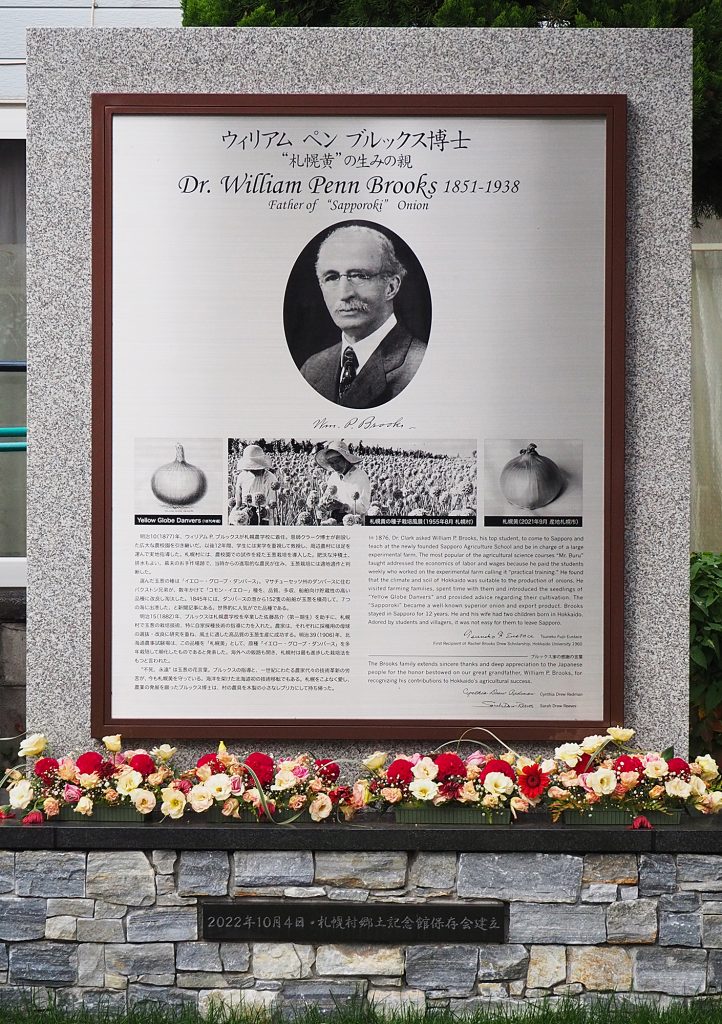 札幌本部 2022.10.10 ブルックス博士顕彰碑 札幌村郷土記念館に建立 タマネギ栽培の導入・普及を指導した札幌農学校二代目教頭ウィリアム・ペン・ブルックス博士(1851~1938年)の顕彰碑が、札幌村郷土記念館(札幌市東区北13条東16丁目)の前庭に建立され、2022年10月4日に除幕式が行われた。式には秋元克広札幌市長らが出席、ブルックス博士の曾孫がインターネットで中継参加した。 ブルックス博士が北米産の「イエロー・グローブ・ダンバース」(以下「イエロー」)を札幌村に持ち込んだとされる。博士が村に通い、多くの農家がタマネギ栽培を始め、札幌村が国内初のタマネギ栽培地となった。「イエロー」は品種改良が重ねられ、札幌の風土に馴化され、在来種「札幌黄」となった。 札幌村郷土記念館は1978年、札幌黄の栽培に貢献した先人の功績を称える「札幌玉葱記念碑」を同館前庭に建立した。碑文には「我が国の玉葱栽培この地にはじまる」と刻まれたが、ここにブルックス博士の名がないことから、山田治仁館長らが「ブルックス博士こそ札幌黄の生みの親」として、新たな顕彰碑の建立に取り組んだ。岩田地崎建設(札幌市中央区)が建立資金を支援した。 新たな顕彰碑は、札幌玉葱記念碑の隣に建てられた。高さ2.3m、幅1.5m。御影石にステンレス製の碑版が埋め込まれ、「ウィリアム ペン ブルックス博士 “札幌黄”の生みの親」と題記された。ブルックス博士の顔写真や博士の業績などが刻まれた。 除幕式では、開拓農民の子孫でつくる札幌村郷土記念館保存会の橋場善光会長、秋元克広札幌市長、岩田地崎建設の岩田圭剛代表取締役社長、在札幌米国領事館のマーク・ウェベルス首席領事の4人が序幕の紐を引いた。碑が披露されると、関係者約70人が集った会場に拍手が広がった。 関係者から寄贈目録を受け取った秋元市長は「市政100周年の節目の年に、ブルックス博士の功績を称え顕彰する碑を市に寄贈いただいたことは大変感慨深い」と謝辞を述べた。またブルックス博士の曾孫であるシンシア・ドル―・レッドマンさんらがインターネット中継で画面から謝辞を述べた。 式後に開催された祝賀会では、橋場会長が挨拶、ウェベルス首席領事が「博士への敬愛と友情にお礼申し上げる」と謝辞を述べ、宝金清博北大総長とマサチューセッツ大学アマースト校のカンブル・スバスワミー学長らのメッセージが読み上げられた。 (事務局)