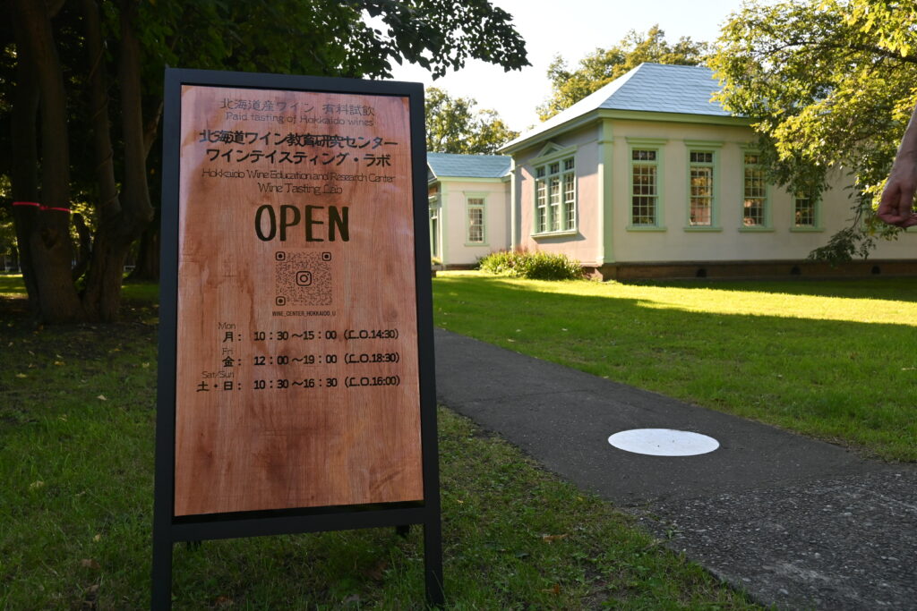 札幌本部 2024.09.09 ワインの試飲始まる 北海道ワイン教育研究センターは9月6日から、一般市民向けの道産ワインの有料試飲「北大ワインテイスティング・ラボ」を開始しました。同センター内の中央部ギャラリーホールにコイン式の自動ワインサーバー2台を設置し、常時12種類の道産ワインをセルフサービスで試飲できるようにしています。 利用者は1500円(税込)で専用コイン3枚をキャッシュレス購入し、好きな3種を選んで試飲できます。12種のボトルが装填されたサーバーにコインを入れ、外から見えるボトルの上のボタンを押すと、そのボトルから1種につき約30ccがグラスに注がれます。 ワインの12種類は時々変更され、道内のよく知られる銘柄のものや、一般には入手困難な北大余市果樹園産のブドウを使用したワインや、同果樹園のリンゴを使用したシードルが選ばれることもあります。 【北海道ワイン教育研究センター(奥)の手前(クラーク像側)に置かれたワインテイスティング・ラボの案内看板】 この取り組みは、センターが広く一般市民に道産ワインの魅力を伝え、ワインの成分と嗜好性の関係などに関する研究を進めようとの狙いから、企画されました。利用者がテイスティング後にスマートフォンでワインに関するアンケートに答えると、オリジナルポストカードなどが進呈されます。 毎週金・土・日・月曜日に行われ、年末年始等を除く通年でサービスされます。開館(サービス)時間は、金曜日12時~19時、土日曜日10:30~16:30、月曜日10:30~15時。ラストオーダーはそれぞれ閉館の30分前。 (事務局。写真も) 最上段の写真は【センター内ギャラリーホールに設置されたワインサーバー(左)とワイン試飲に訪れた利用者】