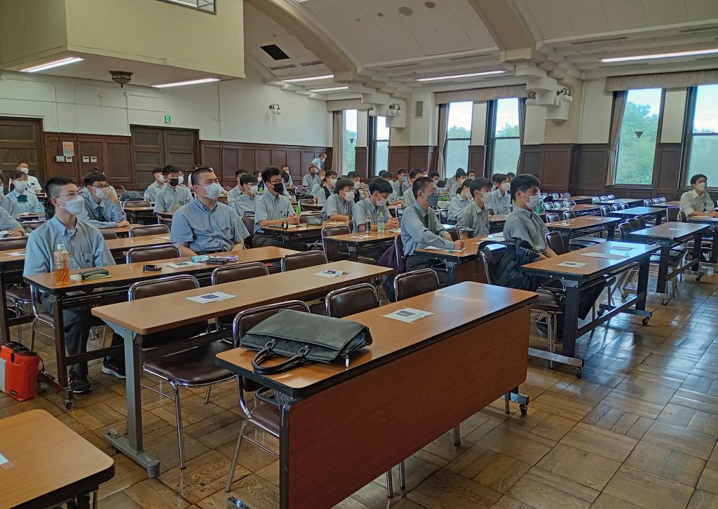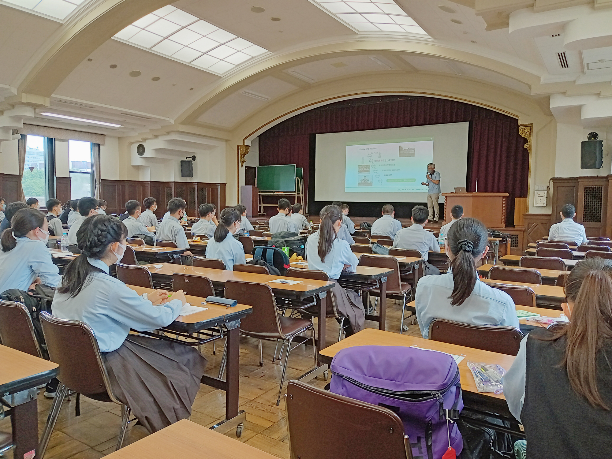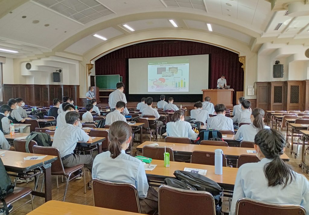 札幌本部 2022.07.12 京都洛南高修学旅行生たちが模擬講義受ける 京都府内の著名な進学校の一つ、私立洛南高校の2年生計約140名が7月10、11日の二日間、北海道大学農学部を訪れ、「模擬講義」を受講しました。大講堂を会場に、農学研究院の3人の教員がそれぞれ1講義ずつ、行いました。 【「模擬講義」に参加した洛南高校の修学旅行生たち=2022年7月10日】 同校の修学旅行の一企画で、道内を5日間で回る旅行のうち、2年生約450名が一部の日程を「北大コース」「ニセココース」「三笠コース」の3コースに分かれてそれぞれの行程に参加しました。さらに、同じ北大コースも日程を二日に分けて、1日が70名ずつになるようにしました。これも新型コロナウイルス感染予防の観点からのプログラム調整です。 講義では副研究院長の久保友彦教授(遺伝子制御学)が農学部全般とテンサイ(ビート)の遺伝について、紹介しました。また当会理事で農学研究院長補佐の石塚敏教授(食品栄養学)がコレストロールを例に、食で病気を防ぐ仕組みを詳しく解説しました。さらに、洛南高校OBの桂真也助教(流域砂防学)が土砂災害のメカニズムについて話しました。久保教授は20分、石塚教授と桂助教はそれぞれ40分間の講義で、二日目は生徒が入れ替わり同様の講義となりました。 受講した高校生の一人は「大学の最先端の研究の話はとても面白く、わくわくしました」と話していました。 【講義を行う洛南高校OBの桂先生=同】 北大は全国各地の高校に「北大」をPRするためプログラムを実施し、8月の夏休みには「オープンキャンパス」を催すなど、高校生たちに「今の北大」を伝えて、意欲ある高校生の獲得に努力してきました。 【「病気にならない食を目指す農学、病気を治す医学」という石塚先生の話に、「普段から医学部と交流があるのですか?」と質問する高校生(起立の男子)=同】 農学部は独自に、修学旅行生たちを受け入れて、農学の幅広く深い世界を紹介したり、北大キャンパスの素晴らしさに触れてもらったりする取り組みを、旅行エージェントと連携して展開してきました。その始まりが2018年5月の横浜市立横浜吉田中学校の修学旅行生たち、二回目が2019年9月の宇都宮海星女子学院高校(栃木県)の修学旅行生たちでした。その後は新型コロナウイルス感染拡大防止のため、中止していました。 (事務局)