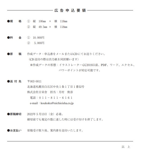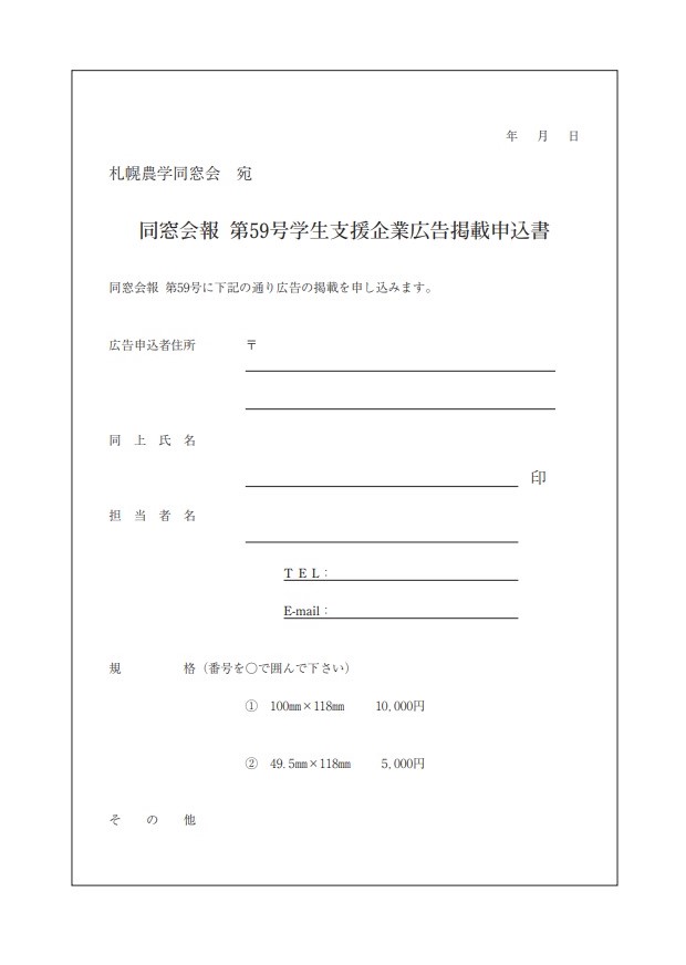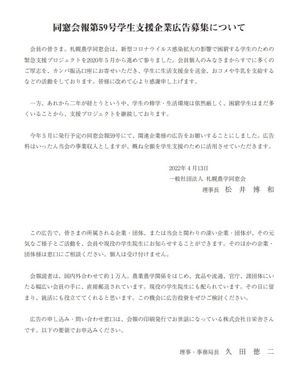 札幌本部 2022.04.13 会報59号への掲載広告募集 札幌農学同窓会は会報第59号(2022年6月発行予定)に掲載される広告を募集します。 会員のみなさんの所属企業・団体様、当会と関係の深い企業・団体様に会報へ広告を掲載いただいて、企業・団体様や会員のお元気な姿、事業内容、活動内容等を宣伝していただき、会員諸氏や現役の学生院生たちにアピールしていただこうという趣旨です。 また、当会として新型コロナウイルスの感染に伴う生活困窮に苦しむ農学生をサポートする「農学生緊急支援プロジェクト」に取り組んでおり、今回の広告による事業収入は、概ね全額を学生支援のために活用させていただきます。 会報の読者は、国内外合わせて約1万人。農業農学関係をはじめ、食品や流通など産業界、官庁、研究機関、諸団体にいたる幅広い会員の手に、直接郵送されています。また、学部内の玄関や同窓会控室などに置いて、現役の学生院生がいつでも手にすることができるようになっています。 会報は、母校の学生・教員と、卒業された方々をつなぐ貴重なメディアの一つです。企業・団体広告が掲載されれば、現役の若者たちの目にとまり、就活にも役立ててくれるはずです。企業・団体のイメージアップにもつながります。この機会に広告をぜひご活用ください。 会報第58号(昨年7月発行)では当会と関係の深い企業様、また会員個人様から計6つの広告をいただきました。この時のサイズと同じサイズ(2種)が今回募集するサイズです。 広告料は比較的低く抑え、利用しやすくしております。掲載件数・スペースに限りがありますので、お早目にお申込み下さい。最終締切は5月13日です。 詳しくは下記添付のPDFファイル「同窓会報第59号学生支援企業広告募集について」、「広告申込要領」、「広告掲載申込書」をご覧下さい。 (事務局)