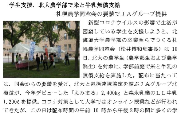 札幌本部 2020.06.15 北海協同組合通信が報道 6月10日に当会が実施した農学生緊急支援プロジェクトの「お米と牛乳の全学生院生への配布」について、雑誌「DAIRYMAN」や「ニューカントリー」を発行している北海道協同組合通信社が、11日付けの「北海協同組合通信」に、記事を掲載しました。同社の許可をいただきましたので、題字と全文を掲載します。 2020年6月11日付け「北海協同組合通信」ダウンロード
