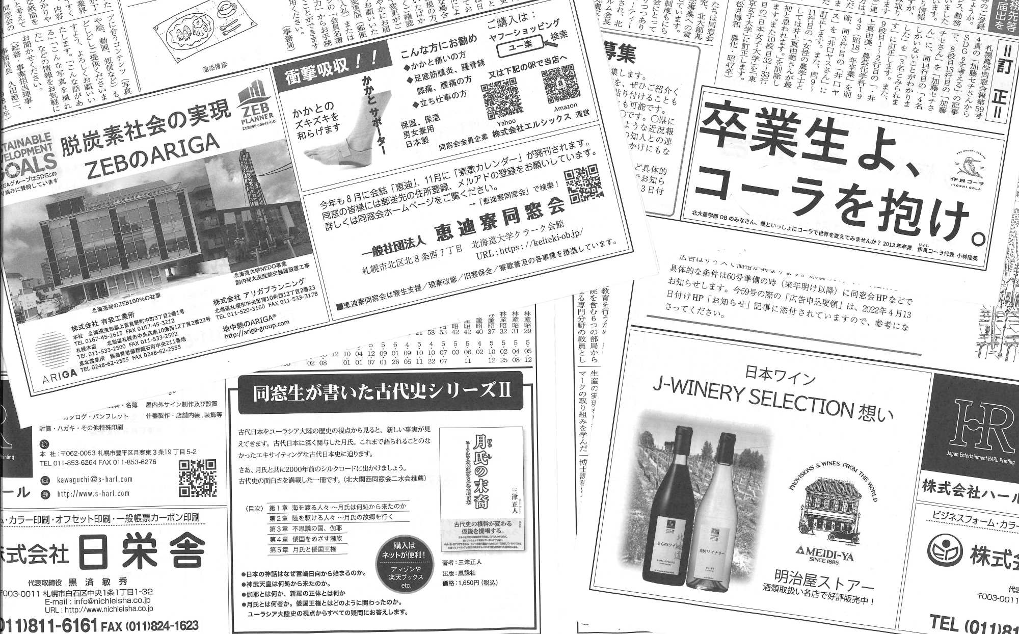 札幌本部 2025.06.01 同窓会報掲載の広告募集 札幌農学同窓会は会報に掲載される広告を募集しています。 会員のみなさんの所属企業・団体様、当会と関係の深い企業・団体様に、会報広告を通じて、企業・団体様や会員のお元気な姿、事業内容、出版物、活動内容等をお伝えいただき、会員諸氏や現役の学生院生たちにアピールしていただこうという趣旨です。 会報読者は、国内外合わせて約1万1千人。農業農学関係をはじめ、食品や流通など産業界、官庁、研究機関、諸団体などで活動する幅広い会員の手に、上質紙印刷のものが毎年1回、直接郵送されています。また、農学部内の全現役学生院生、教員に配布するほか、他学部や北大本部にも送付しています。さらに、当ウエブサイト上には過去数年の会報を見開き画像で読めるアーカイブスも掲載しています。 会報は、各年代の母校の学生・教員と、卒業された方々を縦横につなぐ貴重なメディアの一つです。企業・団体広告が掲載されれば、現役の若者たちの目にとまり、就活にも役立ててくれるはずです。企業・団体のイメージアップにもつながります。出版物や各種商品を多くの人々にお知らせできます。この機会に広告をぜひご活用ください。 広告料は低く抑え、利用しやすくしております。掲載件数・スペースに限りがありますので、お早目にお申込み下さい。 詳しくは下記添付のPDFファイル「広告募集要領」と「広告掲載申込書」をご覧下さい。 同窓会報広告募集要領・申込書ダウンロード
