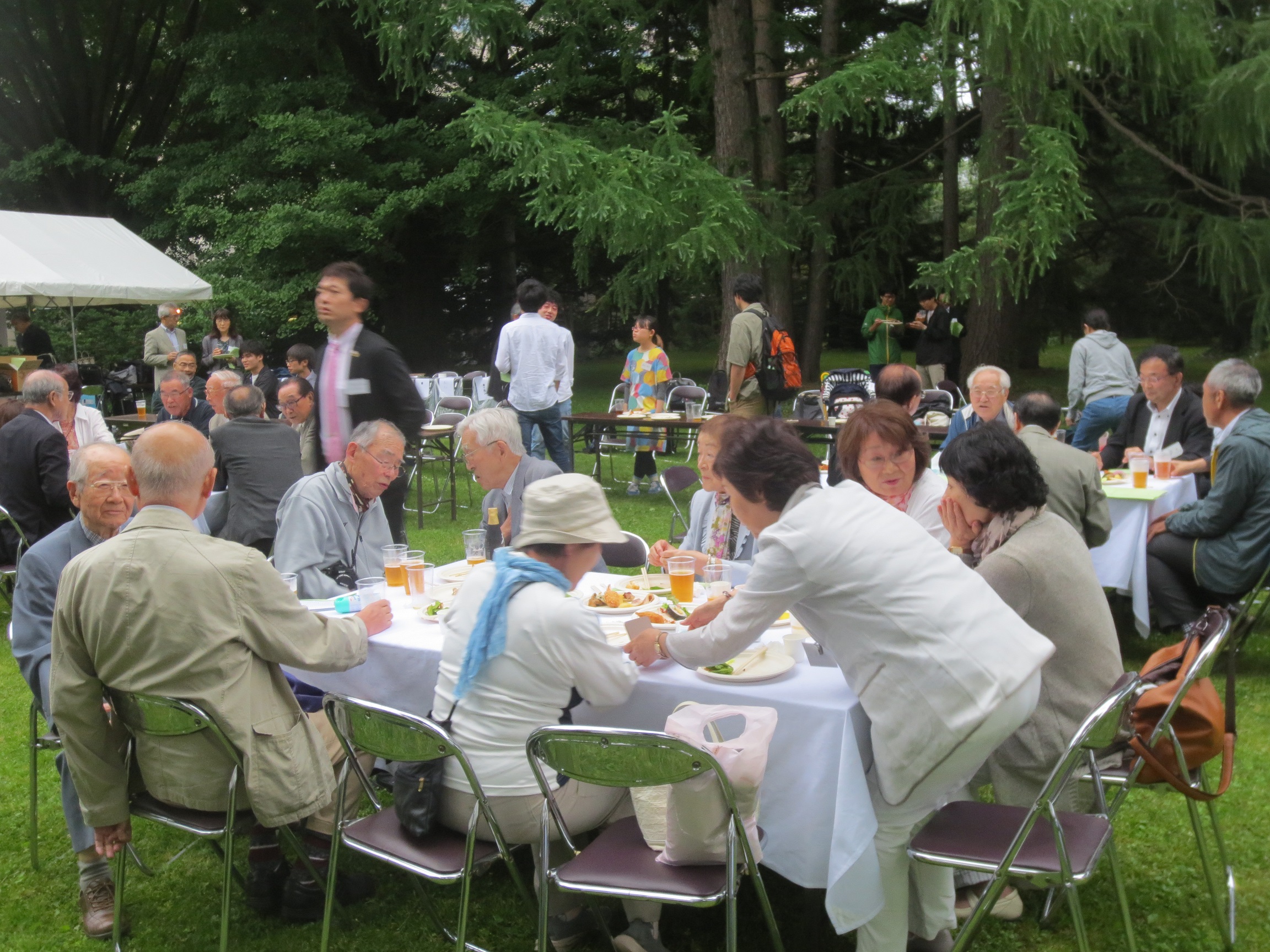 2019.07.12 園遊会(ガーデンパーティー)に181名 親睦園遊会(ガーデンパーティー)が6月28日、北大植物園で開催されました。心配された荒天は避けられ、会員ら181人が参加して盛会となりました。 参加者の顔ぶれは、現役教員のみなさんが28人、学生(バイトを含む)が30人と、例年になく若さが目立ちました。また3組の家族連れが参加されて、子供たちの歓声も響く、とても楽しい場になりました。また招待した関係業者のみなさんもいらっしゃいました。 松井博和理事長、西邑隆徳新研究院長らの挨拶のほか、今年は新任教授のみなさんも挨拶され、参加の先輩、後輩たちから、温かい拍手が送られました。 また、昨年から始まった、道産ワイン応援プロジェクトは今年も継続。同窓会員の関わる2ワイナリー(富良野ワイン、登醸造=余市=)が醸造した美味しいワインが試飲に供されました。また、北大余市果樹園のリンゴを100%使用したシードル(発泡酒)が初めて提供され、参加者のみなさんが味わいました。 従来、ほぼすべての業務を委託していた某ホテルが、直前に委託不可能となりました。そのことから、テーブルと椅子の配置、料理や飲料の手配、片付けとゴミ処理も、すべて同窓会の手によって行うこととなりましたが、多くの会員、理事のみなさんが、その業務に参加してくださり、無事終了しました。事務局からみなさんに感謝申し上げます。 新しいかたちの園遊会は、初めての事態の連続でしたので、参加者のみなさんにはご不便などをおかけしたかと思います。またいろんなご要望もあろうかと思います。ご意見をお寄せください。