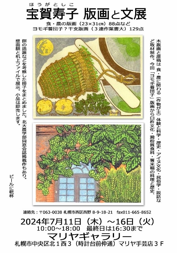 札幌本部 2024.06.23 宝賀寿子さんの版画と文展 札幌で7月11~16日 当会会員で、会員名簿の表紙、会報・会誌の挿絵なども積極的にご寄稿いただいている版画家・宝賀寿子さん(農化、1973年卒)の「版画と文展」が7月11日から16日まで、札幌市中央区北1条西3丁目のマリヤ手芸店で開かれます。 当会会誌に多く掲載されている農作物に関する版画と文章をはじめ、道内の農業や食文化、地誌と地形、鉄道、アイヌ民族の食と文化など幅広いテーマに関する絵や考察文、著作物などを展示します。 入場無料。10時から18時まで。最終日は16:30まで。多くの日は宝賀さんが会場にいらっしゃる予定です。