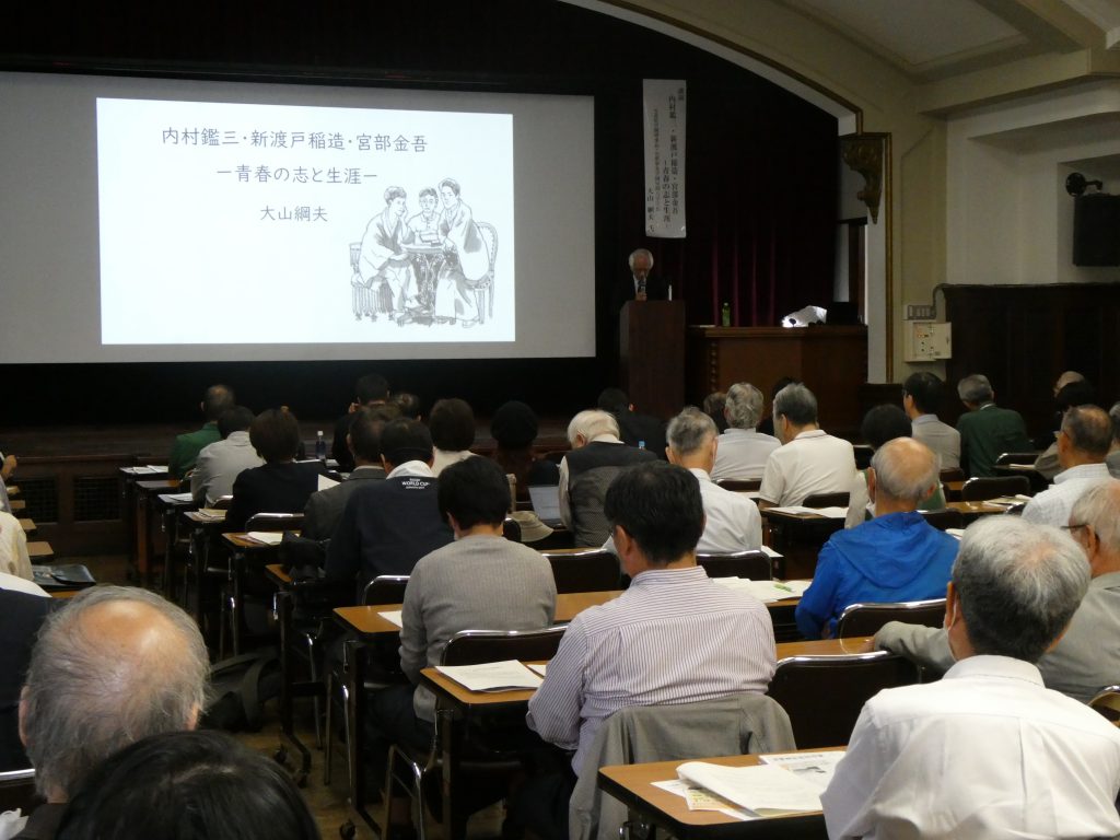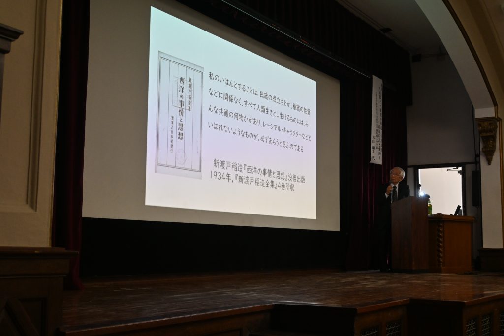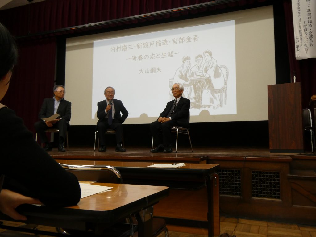 札幌本部 2023.10.02 新渡戸記念講演会で内村研究者の大山氏が講演 新渡戸稲造記念講演会が2023年9月30日、「北大ホームカミングデー2023」の一行事として、北海道大学農学部4階大講堂で開催されました。 札幌農学校二期生で後の教授、また国際連盟事務次長などを務めた新渡戸稲造の名前を冠した記念講演会は昨年に続き2回目。北大大学院農学研究院と当会が主催し、北方生物圏フィールド科学センターと(一社)新渡戸稲造と札幌遠友夜学校を考える会(考える会)が共催。道、札幌市はじめ51団体が後援して行われました。 講師は内村鑑三と新渡戸稲造の研究者で北星学園理事長・元恵泉女学園短期大学学長の大山綱夫(おおやま つなお)氏。『内村鑑三•新渡戸稲造•宮部金吾〜青春の志と生涯〜』と題して講演しました。 大山氏は、いずれも札幌農学校二期生の内村鑑三、新渡戸稲造、宮部金吾の生涯について解説し、特に三人の若き日の思い、札幌農学校に息づいた精神について詳しく話しました。また、北海道大学に引き継がれた理念や今後必要とされることについて示唆しました。 会冒頭には、野口伸農学研究院長が主催者を代表して開会挨拶。講演会後半には、大山氏と、昨年の新渡戸記念講演会の講師である藤井茂・一般財団法人新渡戸基金理事長、久田徳二・北大客員教授の3人がパネルディスカッションを行いました。当会と考える会の松井博和理事長が閉会挨拶しました。 会場の席をほぼ埋めた講演参加者は、先人たちの逸話や専門家たちの見方に耳を傾け、当時の熱い空気を感じていました。 (さっぽろ農学校リポーター・安田萌々恵=2年=、写真も)
