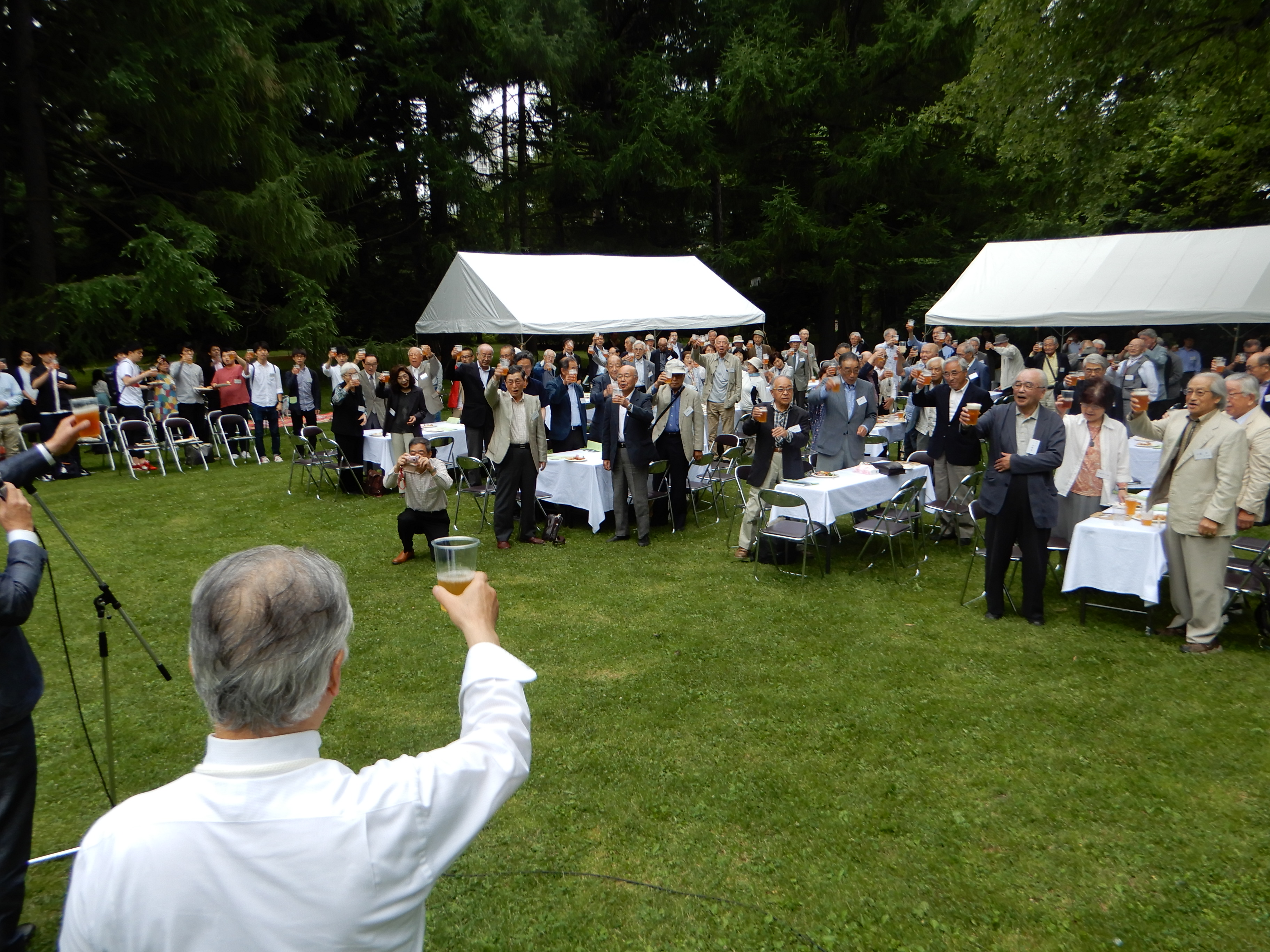 札幌本部 2020.04.22 本年の園遊会は中止 6月26日(金)に北大植物園で開催予定でありました2020年度の親睦園遊会(ガーデンパーティー)を、新型コロナウイルス対策のため、中止といたします。 ウイルス感染拡大の中、政府が「緊急事態宣言」対象地域を全国に拡大することを決定、北海道は特定地域となりました。札幌ではライラックまつりやYOSAKOIソーラン祭り、PMF札幌2020などがすでに相次いで中止となっています。 当会としては、こうした状況などを受け、会員各位のご健康維持、感染抑制を目指す社会的責任等を踏まえ、園遊会中止を決定いたしました。 初夏の緑の中、同窓の集まりを楽しみにしておられたみなさん。大変残念ですが、ご理解くださいますよう、お願い申し上げます。どうか、ウイルスなどに充分お気を付けて、お元気で過ごされますよう。園遊会は来年を楽しみにしてください。 ※写真は2019年度ガーデンパーティー乾杯のシーン