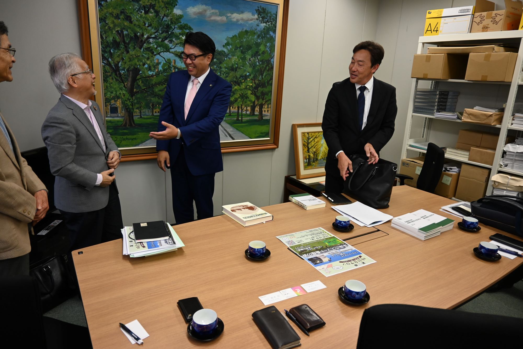 札幌本部 2023.10.04 桜井・美唄市長が当会を表敬訪問 今年6月の美唄市長選で初当選した桜井恒(ひさし)氏=写真右から2人目=が10月3日、当会事務所を訪れ、松井博和理事長=同3人目=に表敬挨拶しました。桜井氏は当会会員(応生・平19卒)。 訪問には同市経済部の土屋貴久部長と農政課の澤田宜己氏が同行。当会からは久田徳二理事・事務局長と橋本博行理事・事務局次長が同席しました。 一同は学生時代の思い出や恩師などについて和やかに懇談。今後の連携などについても話し合いました。