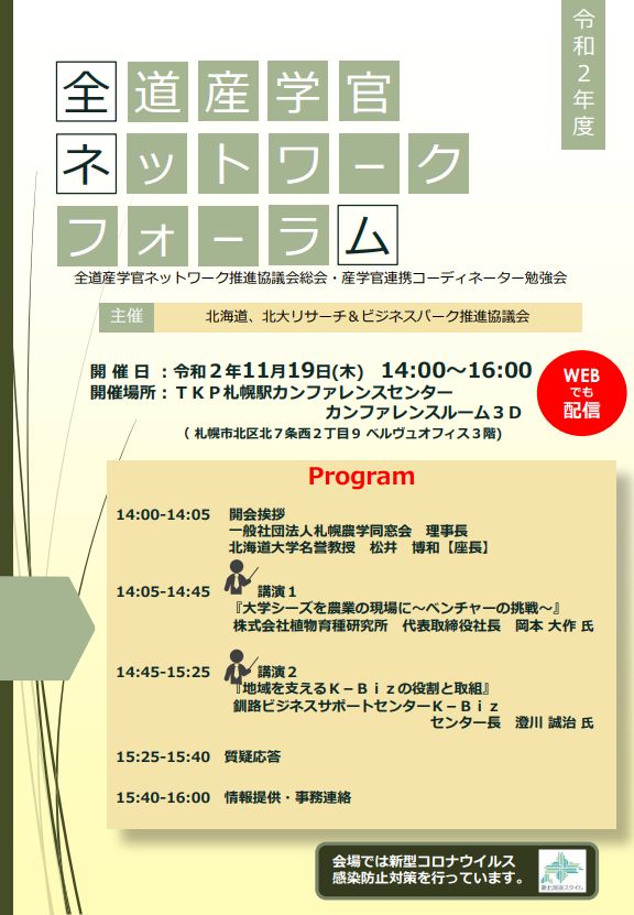 札幌本部 2020.11.15 産学官フォーラムに岡本会員出演へ 道など主催の「全道産学官ネットワークフォーラム」(11月19日開催)に会員の岡本大作さん(農化1991年卒)が講師として出演することになりました。松井博和理事長が座長として開会挨拶します。 フォーラムは、全道産学官ネットワーク推進協議会総会・産学官連携コーディネーター勉強会として毎年行われており、今年は札幌市内で対面(定員50人)で開催されると同時に、新型コロナウイルス感染防止のためウエブ配信も行われます。 岡本会員は株式会社植物育種研究所(栗山町)の代表取締役社長として活躍され、当日は「大学シーズを農業の現場に~ベンチャーの挑戦~」と題して40分講演する予定です。 午後2時から4時、札幌市北区北7西2のTKP札幌駅カンファレンスセンターで行われます。ウエブ参加に必要なURLなど、問い合わせは道科学技術振興課(011-206-6478)へ。