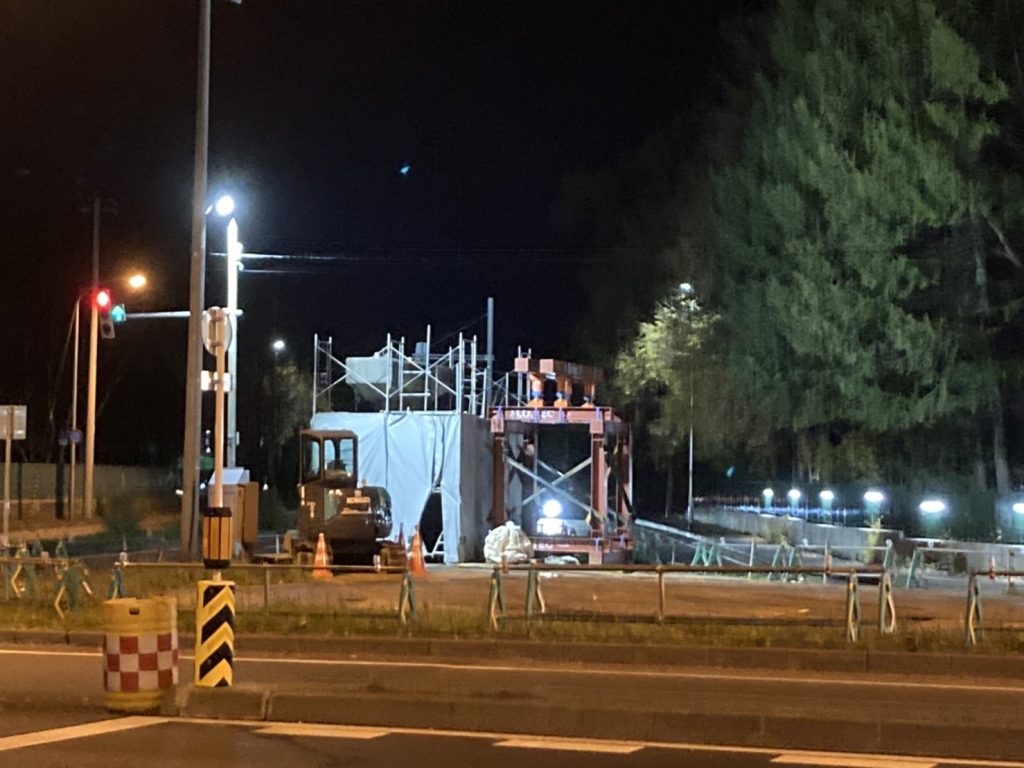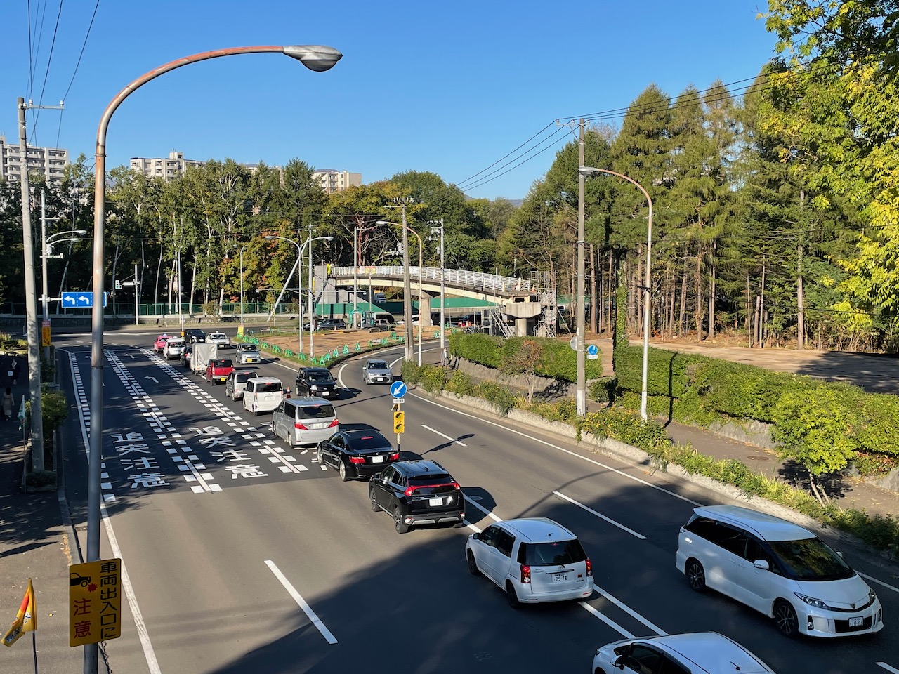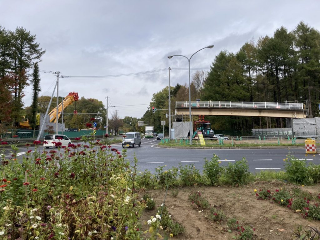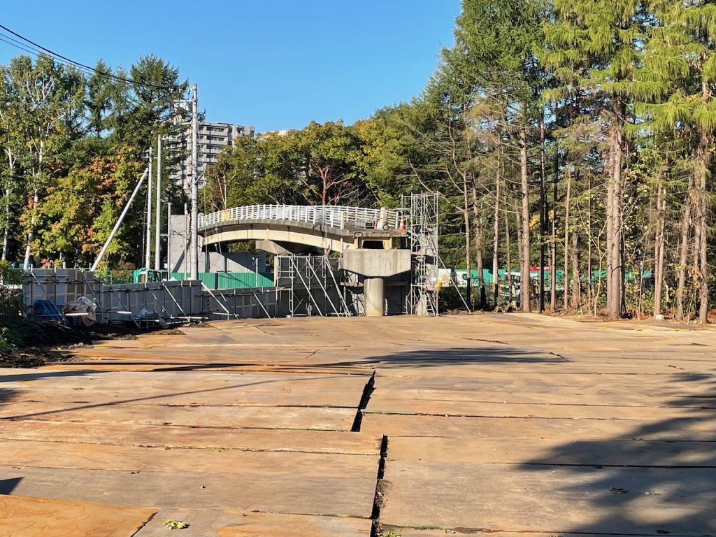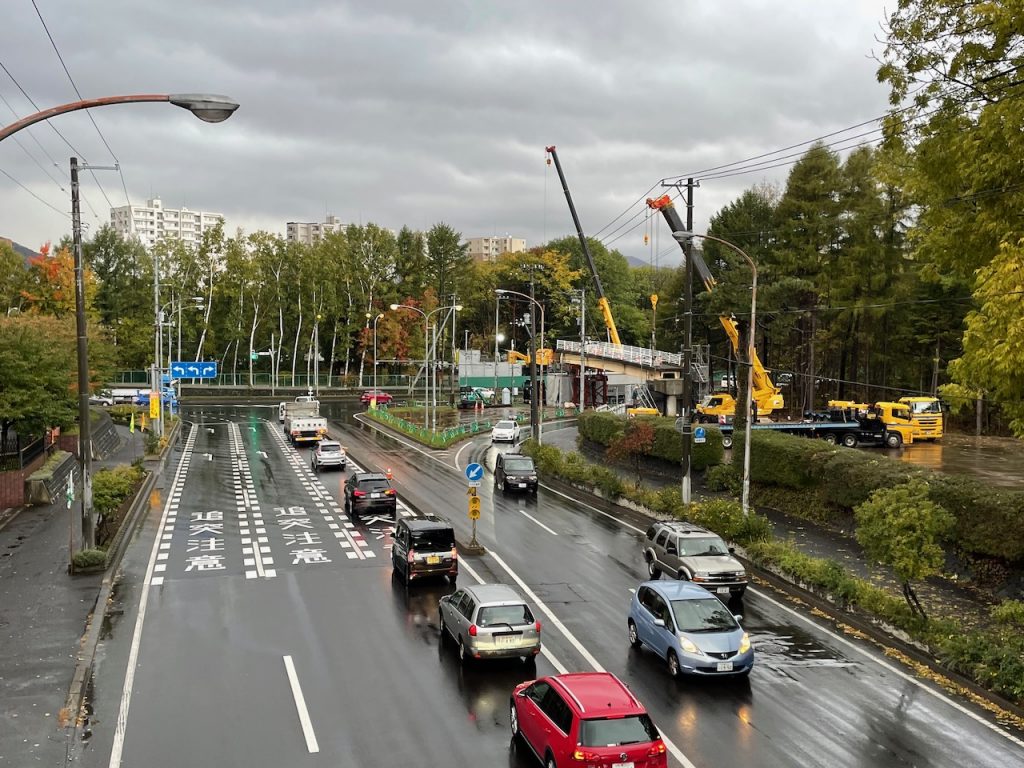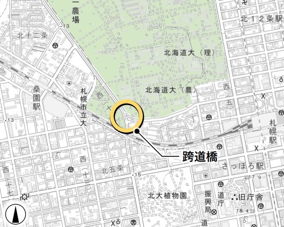 札幌本部 2022.01.10 石山通跨道橋撤去される 農学部キャンパスと、南西の札幌研究林実験苗畑を空中でつないでいた陸橋(通称・石山通跨道橋)が、半世紀の役割を終えたとして、2021年秋に撤去されました。 農場の西側を南北に走る石山通りと、農学部校舎の南を東西に走る北8条通りの交差する地点で、石山通りにかかる陸橋です。1972年の札幌オリンピックの際、北海道大学の敷地内に石山通を通す都市開発が行われ、道路の開通によりキャンパスが東西に分断されてしまうため、キャンパス内往来用に設置されました。 農学部S棟南西側の生物環境工学科実験棟をさらに西へ進むと、樹林の中を縫うように伸びる橋があり、入口に「実験苗畑」の看板がありました。橋は幅2メートル長さ50メートルほどのもので、西側に渡ると研究林が広がり、奥には留学生などのためのインターナショナルハウスがあります。橋は、林学関係の教職員や学生、留学生らがよく利用していました。ほかの学科の人たちは渡った経験が多くないと思われます。桑園駅側には出入口はなく、一般市民の利用はほとんどありません。 橋は設置から約50年経って老朽化し、現在の構造基準と合わなくなったことから、撤去されることになりました。 【重機を設置できるよう樹木が伐採された農学部キャンパス側の土地=10月13日撮影】 工事は8月23日から10月25日にかけて行われました。重機など工事車両が近づいて作業できる場所を確保するため、9月までは橋の東西両側の森林を伐採し、「クレーンヤード」を設置。その後、橋本体の撤去作業が行われました。 【橋桁切断撤去直前の陸橋=10月14日撮影】 【橋桁の西側(左側)半分が切断・撤去された=10月21日撮影】 【北8条通りに架かる歩道橋の上から西を望む=10月21日撮影】 石山通は非常に交通量が多く、橋下の道路交通に配慮する必要があります。そこで、陸橋本体の解体作業が最小限で迅速になるよう、橋を中央で切断して東西に2分割し、1,200トンの超大型クレーンにより一つずつ吊り上げられ、大学構内に降ろした後処分されました。橋がかかっていた場所には横断歩道が設置されました。 【橋桁の東側(右側)半分も撤去され、橋脚だけが残った直後の交差点=10月25日深夜撮影】 伐採された木材は、アートを通した科学技術コミュニケーションの実践研究として活用していく予定です。具体的には、市民の跨道橋の思い出を集めた「さよなら、アノハシ」や、地元の家具作家による椅子の作成「札幌の椅子、北海道の木2021」などが行われる予定です。これらの取り組みは、「アノオンシツ」プロジェクトの一環として行われる予定となっています。 「アノオンシツ」プロジェクト(リンクhttp://anogreenhouse.com/) 【陸桁全体撤去後の石山通り=10月26日撮影】 跨道橋撤去工事に関しては、以下の幾つかの媒体でも発信されていますのでご参照ください。クリックするとサイトを見られます。 いいねHokudai! UHB (さっぽろ農学校リポーター・林芳弘=D2=、写真も)