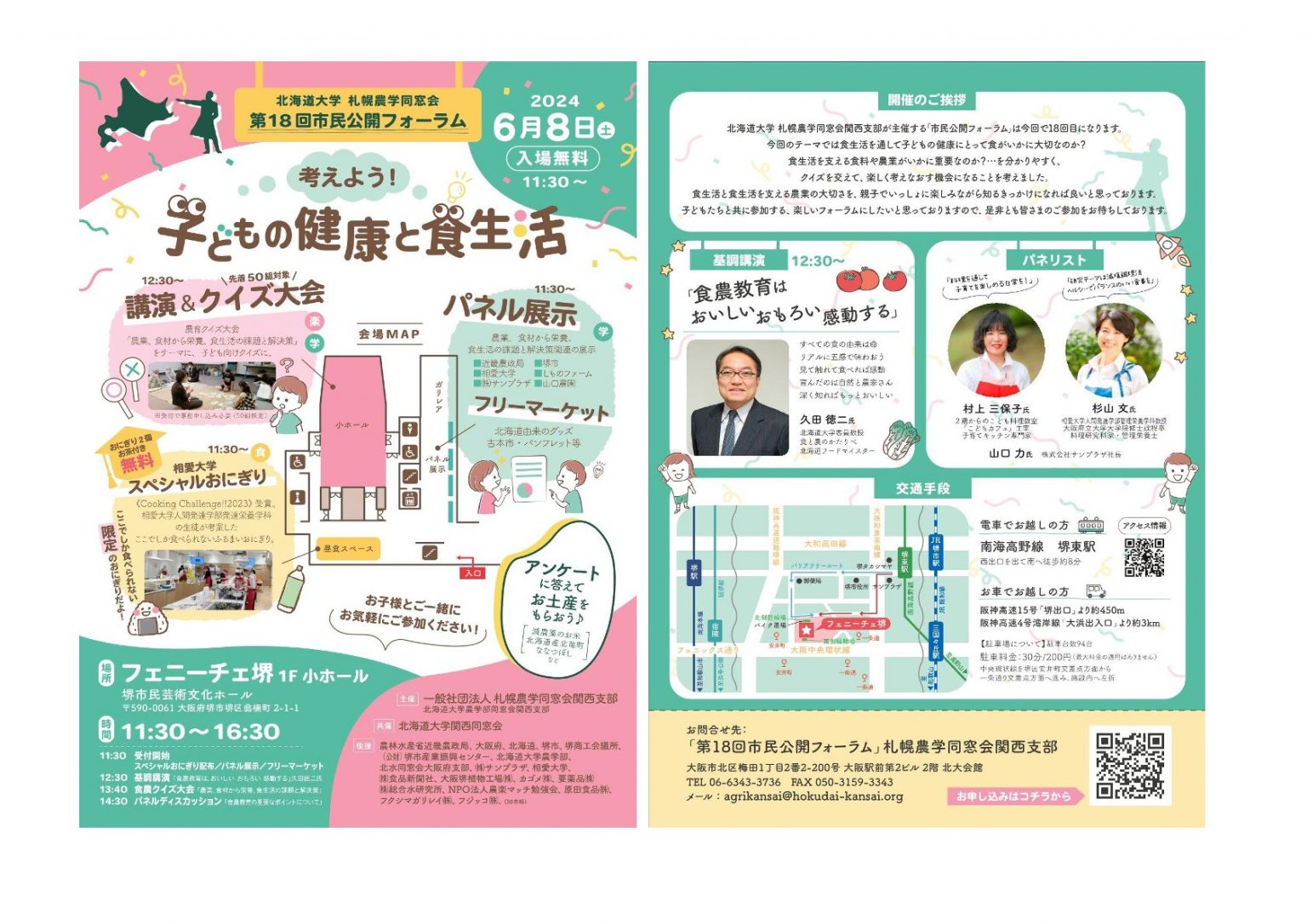 関西支部 2024.04.24 第18回市民公開フォーラムのお知らせ 【第18回市民フォーラム開催のお知らせ】 〇テーマ: 考えよう!子どもの健康と食生活 〇開催日時: 2024年6月8日(土)11:30~ 〇参加費: 無料 (一社)札幌農学同窓会関西支部が主催する「市民公開フォーラム」は、今回で18回目になります。 今回の市民公開フォーラムでは、「食生活において、子どもの健康に食がいかに大切なのか?」、「食生活を支える食料や農業が、いかに重要なのか?」を、クイズを交えて、分かりやすく、楽しく、考える企画を考えました。 食生活と食生活を支える農業の大切さを、親子でいっしょに楽しみながら、考える機会になれば良いと思っております。 子どもたちと共に参加する、楽しいフォーラムにしたいと思っておりますので、是非とも皆さまのご参加をお待ちしております 〇会場: 堺市民芸術文化ホール フェニーチェ堺 〒590-0061 大阪府堺市堺区翁橋町2丁1-1 〇参加申込方法: 以下のURLから、お申し込みください。 https://docs.google.com/forms/d/e/1FAIpQLSfj2ryK-JnOFGIXZb6kMHJ-gRukb-QWpwNutxH4_I3k7t40aA/viewform (一社)札幌農学同窓会 関西支部