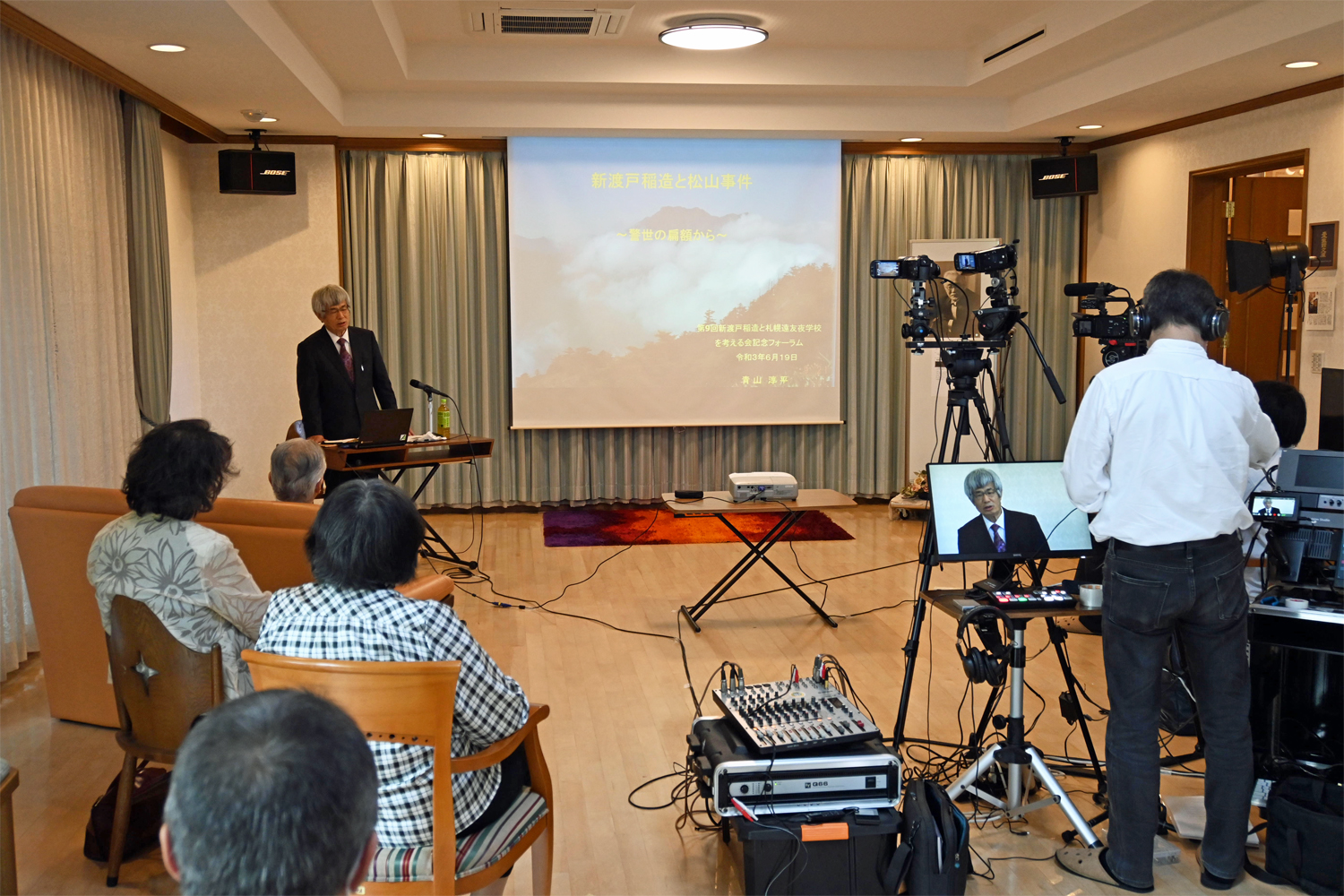 札幌本部 2021.06.21 青山淳平氏が講演 考える会フォーラム 当会と本学の大先輩である新渡戸稲造博士の事績と、博士が設立した札幌遠友夜学校の歴史を研究・普及し次世代育成に貢献している一般社団法人「新渡戸稲造と札幌遠友夜学校を考える会」(松井博和理事長)が主催する第9回記念フォーラムが6月19日(土)、札幌市内の秋山財団ホールで開催され、作家の青山淳平氏が基調講演を行いました。 演題は「新渡戸稲造と松山事件 ~警世の扁額から~」。よく知られる松山事件(1932年)の舞台となった愛媛県内での新渡戸博士の行動を丁寧に追い、事件の後に苦境に追い込まれた当時の時代的状況とともに、博士が揮毫したとされる扁額「Tranquillity of Ocean Depth(深海の如き静けさ)」の謎に迫るノンフィクションストーリーに、集まった人々はじっくり聴き入りました。 青山氏は評伝、小説を中心に活躍し、『海市のかなた-戦艦「陸奥」引揚げ』(中央公論新社)など多数の著書があり、映画「ソローキンの見た桜」の原作者でもあります。2020年10月には『それぞれの新渡戸稲造』(本の泉社)を上梓。同書に収録された小説三編の一つが「新渡戸博士の扁額」で、ここでもその謎を追っています。北海道へは、同書取材のほか、戦艦「陸奥」やビハール号事件、新田長次郎などの取材で何度も来訪しています。 講演で青山氏は、松山事件を巡る報道などについて詳しく解説。新渡戸博士を攻撃する新聞と擁護する新聞が現れる中、「擁護の背景には大きな力が働いていたのではないか」との推論を展開しました。新渡戸博士は事件の翌年、日本が国際連盟脱退を表明した直後にカナダで客死しています。 扁額は、戦争突入へとゆがむ時代に、軍閥支配を批判した警世のメッセージではないかとされていますが、松山市に近い愛媛県宇和町の教会に掲げられていた扁額に署名がないことなどから真相を追った青山氏は、一人の札幌農学校卒業者が揮毫者である可能性に辿り着きます。愛媛県出身、39年本科卒業の末光績(すえみついさお)です。 末光は明治33年札幌農学校予科入学直後にトーマス・カーライルの読書会で「衣装哲学」を読みました。新渡戸博士に大きな影響を与えた書です。先輩の一人有島武郎と親交が厚く、熱心なキリスト者として成長し、教会の日曜学校と遠友夜学校の教師を務めました。 青山氏は講演の最後に、有島武郎が情死した5カ月後に創刊された雑誌「青年と處女(おとめ)」掲載の末光の詩を紹介しました。「時代の惨憺たる廃墟の中で 大きな梁木の一端に手をかけ べた潰れになった巨大なものを バリツ…バリバリツ…と持ち揚げて 下に拉(ひし)がれて居る生純なものを 自由と生命に放ってやる 更に偉大な人が出て欲しい」(抜粋)。 フォーラムは当初、かでる2・7で多くの市民を集めて開催される予定でしたが、6月20日までの緊急事態宣言延長を受けて会場を変更し、関係者だけが集って行われました。フォーラムの様子は撮影され、編集後にオンライン配信される予定です。