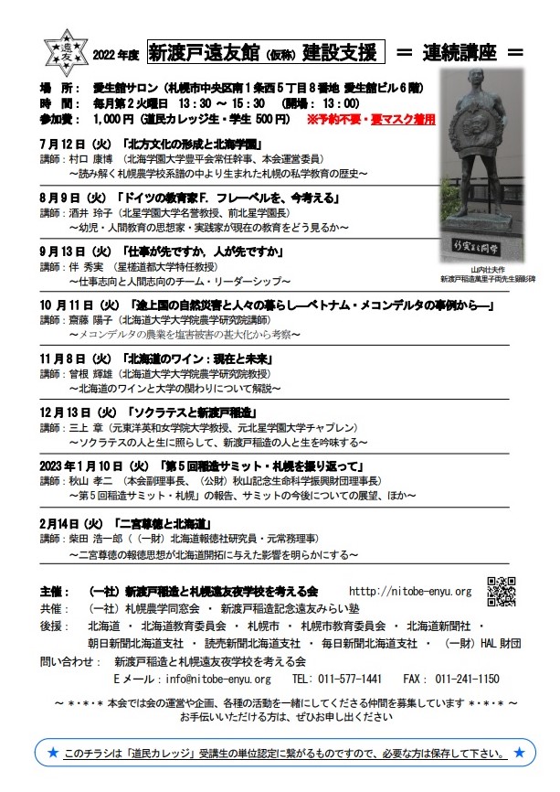 札幌本部 2022.05.13 2022年度新渡戸連続講座ラインナップ決まる 一般社団法人「新渡戸稲造と札幌遠友夜学校を考える会」が毎年8回程度開催している「新渡戸遠友館(仮称)建設支援連続講座」の2022年度ラインナップが決まりました。 いずれも興味深いテーマと講師陣ですが、11月には北大大学院農学研究院の曾根輝雄教授が「北海道のワイン:現在と未来」と題し講演します。「エルムの森プロジェクト」が学内のクラーク像向かいの旧昆虫学・養蚕学教室を改修して完成を目指す「ワイン教育研究センター」で、ますます注目される北海道ワインの振興に、北大がどうコミットするか、などに話題が及ぶとみられます。 また、来年2月には一般財団法人北海道報徳社の柴田浩一郎元常務理事が「二宮尊徳と北海道」について講演します。北海道開拓には尊徳の報徳思想とそれを胸にした報徳人たちの努力が不可欠でしたが、報徳思想は、新渡戸稲造や賀川豊彦の活動にも影響を与えたともみられます。 各回とも対面講座で、道民カレッジ連携講座ともなっています。札幌農学同窓会も共催に加わり、多面的にバックアップしています。ふるってご参加ください。 (事務局)