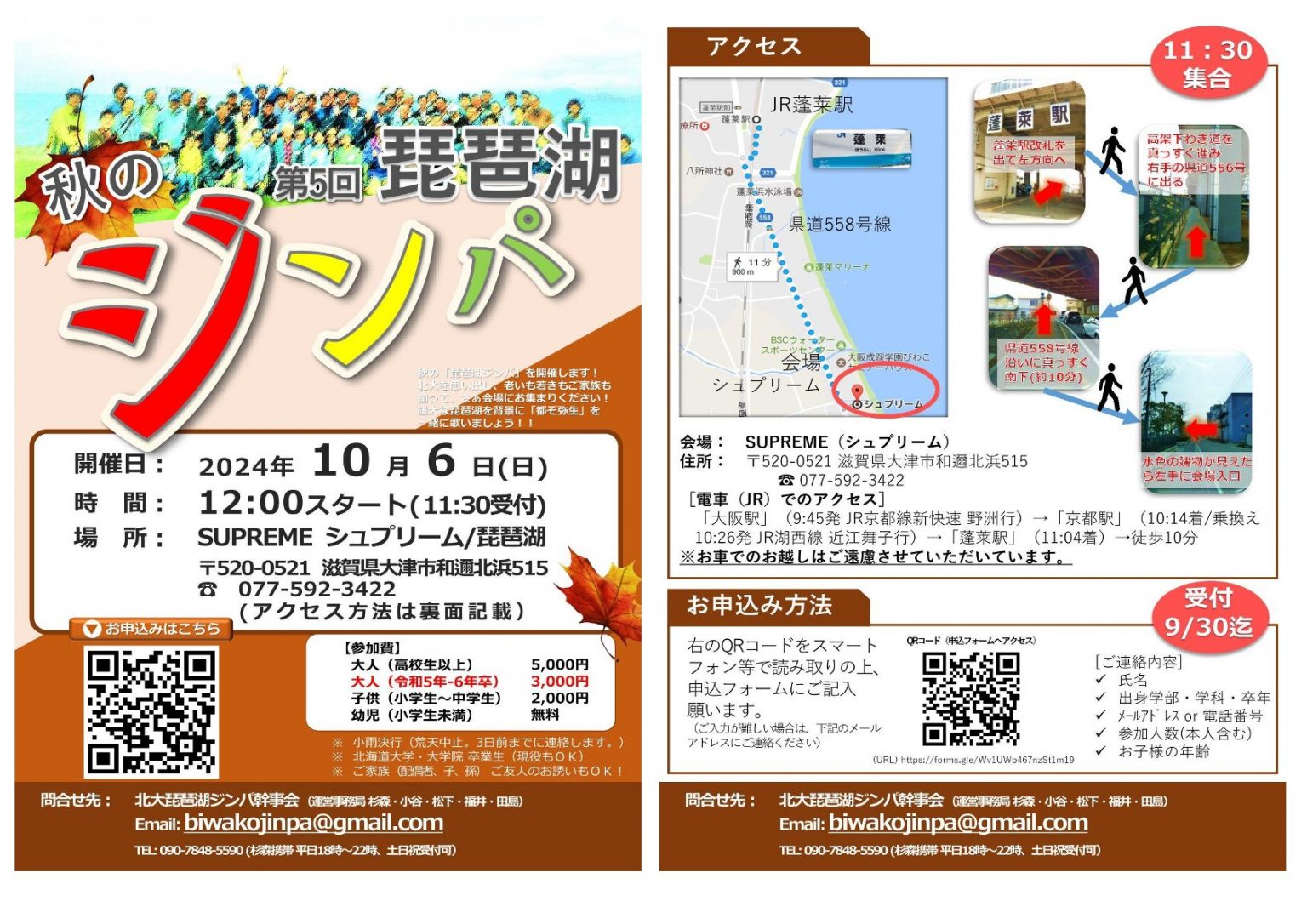 関西支部 2024.05.24 2024年琵琶湖ジンパのお知らせ 1 【第5回 秋の琵琶湖ジンパ】 雄大な琵琶湖のほとりで、学生時代に味わったジンパを、世代や立場に関係なく、家族・友人も交え、和やかに楽しみましょう。ジンギスカンをはじめ、牛肉、焼きそば、野菜、もちろんビール、各種ドリンク等ご用意いたします。老いも若きもご家族そろって、さあ会場にお集まりください。琵琶湖をバックに、「都ぞ弥生」を一緒に歌いましょう!是非、皆様のお申し込みをお待ちしております。ご家族、お子様、ご友人もお誘い頂けましたら幸いです。お酒をご持参いただける方は大歓迎です! 開催日:2024年10月6日(日)時 間:12:00 スタート(11:30受付開始)場 所:SUPREME シュプリーム/琵琶湖 〒520-0521 滋賀県大津市和邇北浜515会 費:大人(高校生以上)5,000円 大人(令和5年・6年卒 本人に限る)3,000円 子供(小学生~中学生)2,000円 幼児(小学生未満)無料 ※お申込みは、こちら↓からお願いします! (URL) https://forms.gle/MLdM1Vpa5bZvp5NP8 北大琵琶湖ジンパ幹事会
