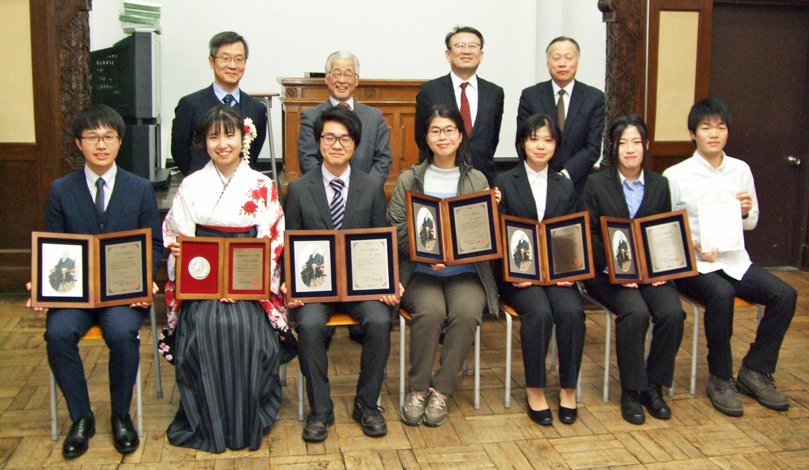 札幌本部 2020.04.16 3月25日に卒業・修了時表彰式 2020年3月25日に予定されていた北海道大学学位授与式は、新型コロナウイルス感染防止の観点から中止となりました。例年なら農学部大講堂で開催されていた同窓会主催の祝賀会も中止としました。 ただ、母校(農学部・大学院農学院)と同窓会共催の卒業・修了時表彰式と、学位記ホールダーの配布は例年通り実施しました。 表彰式は、いつもの祝賀会会場である大講堂ではなく中講堂において、関係者だけの出席で執り行いました。森春英・農学研究院副院長が受賞者に1人ずつ賞状と盾を授与し、祝辞を述べました。また当会の松井博和理事長が祝辞を贈りました。 受賞者は以下の通り(敬称略)。 〇新渡戸稲造農学賞:中村亮太(共生基盤学専攻修士課程) 〇北海道大学クラーク賞:黒岩杏佳(生物資源科学科) 〇クラーク農学賞:徳山芳樹(応用生命科学科)、塩原幸(生物機能化学科)、豊島楽子(森林科学科)、福山優香里(畜産科学科)、辻橋真琳(生物環境工学科)、中牟田直英(農業経済学科) ※新渡戸稲造農学賞:農学院修士課程から後期博士課程に進学する日本人学生の中で、特に優秀な院生1名を、農学院と当会が表彰するもの ※北海道大学クラーク賞 とクラーク農学賞:学業成績が特に優秀な者1名(学科のローテーションで選考)を北海道大学が表彰し、その他の学科の優秀者には農学部と当会がクラーク農学賞として表彰するもの ■写真:前列は表彰を受けた7人(左から中牟田、黒岩、徳山、福山、豊島、辻橋、中村=敬称略=)。後列は左から森春英副院長、松井博和理事長、野口伸副院長、山本康貴教授(教務委員会委員長)
